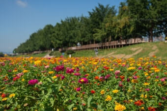 은행나무길 주변 산책로 및 하천변에는 은행나무만 있는 것이 아니라 다양한 가을꽃이 피어나 산책의 즐거움을 더합니다. 대표적으로 코스모스(흰/핑크/보라), 백일홍, 그리고 댑싸리(가을억새류) 등이 조성되어 있어 노란 은행잎과 대비되는 색감이 아름답습니다. 각 꽃들의 개화 및 절정 시기를 감안하면 다음과 같습니다: