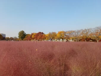 단풍이 붉게 물들고, 핑크뮬리가 바람에 흔들리는 호수변 산책로는 흔히 접하기 어렵지만, 미사경정공원에서는 그 세 가지가 한데 어우러진 풍경을 만끽하실 수 있습니다.