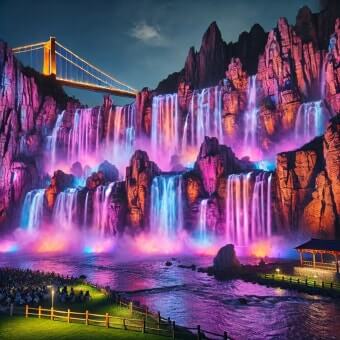 ‘나오라쇼’는 소금산 그랜드밸리의 야간 프로그램으로, 낮의 절경과는 또 다른 감동을 주는 빛과 음악의 조화 공연입니다. 암벽 면 전체를 스크린 삼아 미디어파사드 영상이 투사되며, 음악 분수와 야간 조명, 레이저 효과 등이 결합되어 ‘빛의 밤’을 연출하는 테마 공연 구성으로 방문객의 시선을 사로잡습니다.