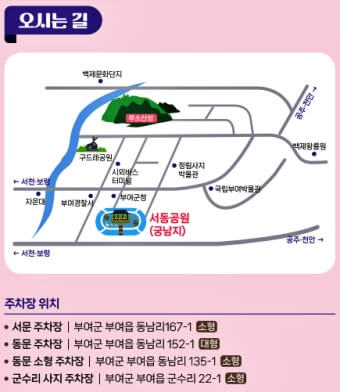 | 자가차량 | 서동공원 주차장·궁남지 인근 공영주차장 이용 가능, 주말 · 야간 주차 혼잡 예상 |