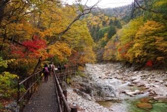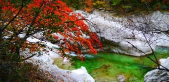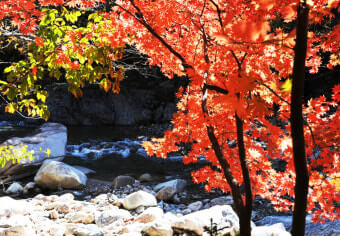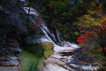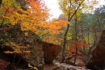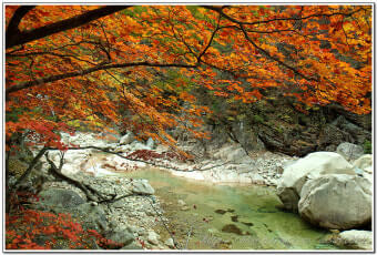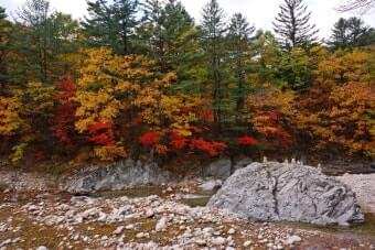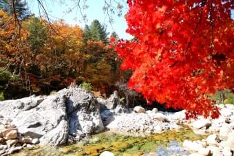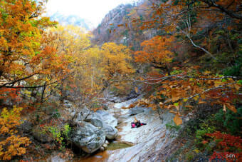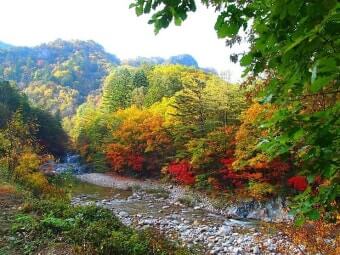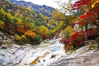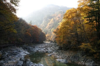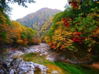 이 시기에는 계곡 양 옆의 나무들이 붉은색, 오렌지빛, 노란빛으로 물들며 숲 전체가 마치 화려한 수채화처럼 변합니다.