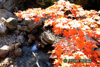 특히 맑은 계곡물 위에 비친 단풍이 이중으로 풍경을 만들어내어 사진이나 영상으로 담기에 매우 좋은 환경입니다.