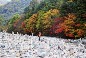 우선 백담사 입구에서 자연관찰로를 따라 계곡 곁을 걷기 시작하면 돌탑이 연이어 나타나는데, 이 작은 돌탑들은 등산객들이 하나씩 쌓은 것으로 계곡 풍경과 어우러져 운치 있는 장면을 연출합니다.