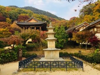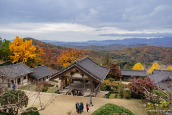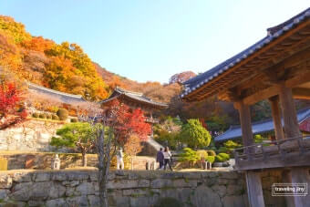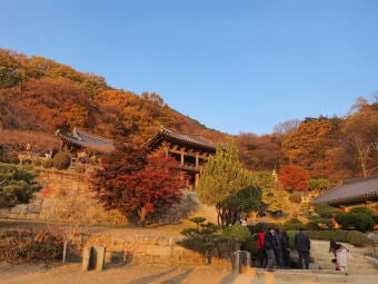 천왕문을 지나 범종각 쪽으로 올라가면 단풍과 돌계단, 적당한 경사의 산길이 이어져 걷는 동안에도 다양한 시점에서 사찰의 건축물이 드러나고, 나무사이로 보이는 붉고 황금빛 단풍이 눈길을 끕니다.