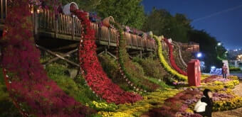 축제 기간 동안 펼쳐지는 프로그램은 크게 세 가지 축으로 나뉩니다. 첫째, ‘국화존’에서는 대형 국화 조형물과 꽃길이 마련되어 낮과 밤 모두 다른 매력을 보여줍니다. 예컨대 국화로 만든 ‘국화 궁전’, ‘국화 책’ 등의 테마 조형물과 메타세쿼이아 길을 따라 조성된 산책로가 있어 포토스폿으로 인기가 높습니다. 둘째, ‘온천존’에서는 지하 200 m 이상에서 끌어올린 약알칼리성 라듐 온천수로 발을 담그는 족욕 체험이 마련되어 있으며, 국화정원과 온천이 어우러지는 이색적인 힐링 공간이 조성되어 있습니다. 셋째, 주말 및 특정 시간대에는 버스킹, 야간 조명 산책, 음악회 및 불꽃쇼 등이 마련되어 있습니다. 이처럼 꽃 감상 + 온천 힐링 + 공연이라는 삼박자가 어우러져 축제 경험이 더욱 풍부해졌습니다.