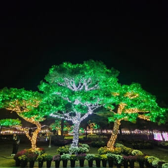 조명이 켜지는 순간부터 색이 바뀌는 꽃밭 사이 산책로는 마치 동화 속 길처럼 연출되어, 낮에는 보이지 않던 분위기와 감성이 방문객을 사로잡습니다. 꽃잎 위에 부드럽게 내려앉은 전구 빛, 연못 주변의 반사광 그리고 바다와 맞닿은 낮의 정원과는 또 다른 느낌이 완성됩니다.